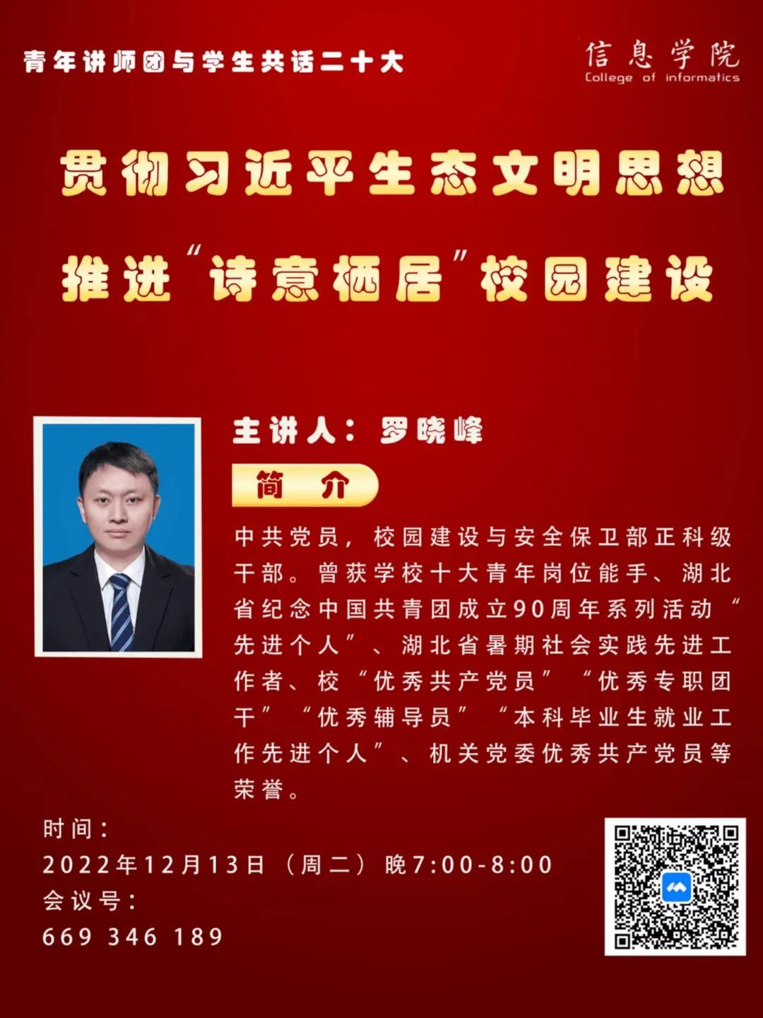 青年讲师团成员罗晓峰老师,于12月13日晚7:00-8:00,进行“贯彻习近平生态文明思想,推进‘诗意栖居’校园建设”的线上主题宣讲,带领家庭教师av