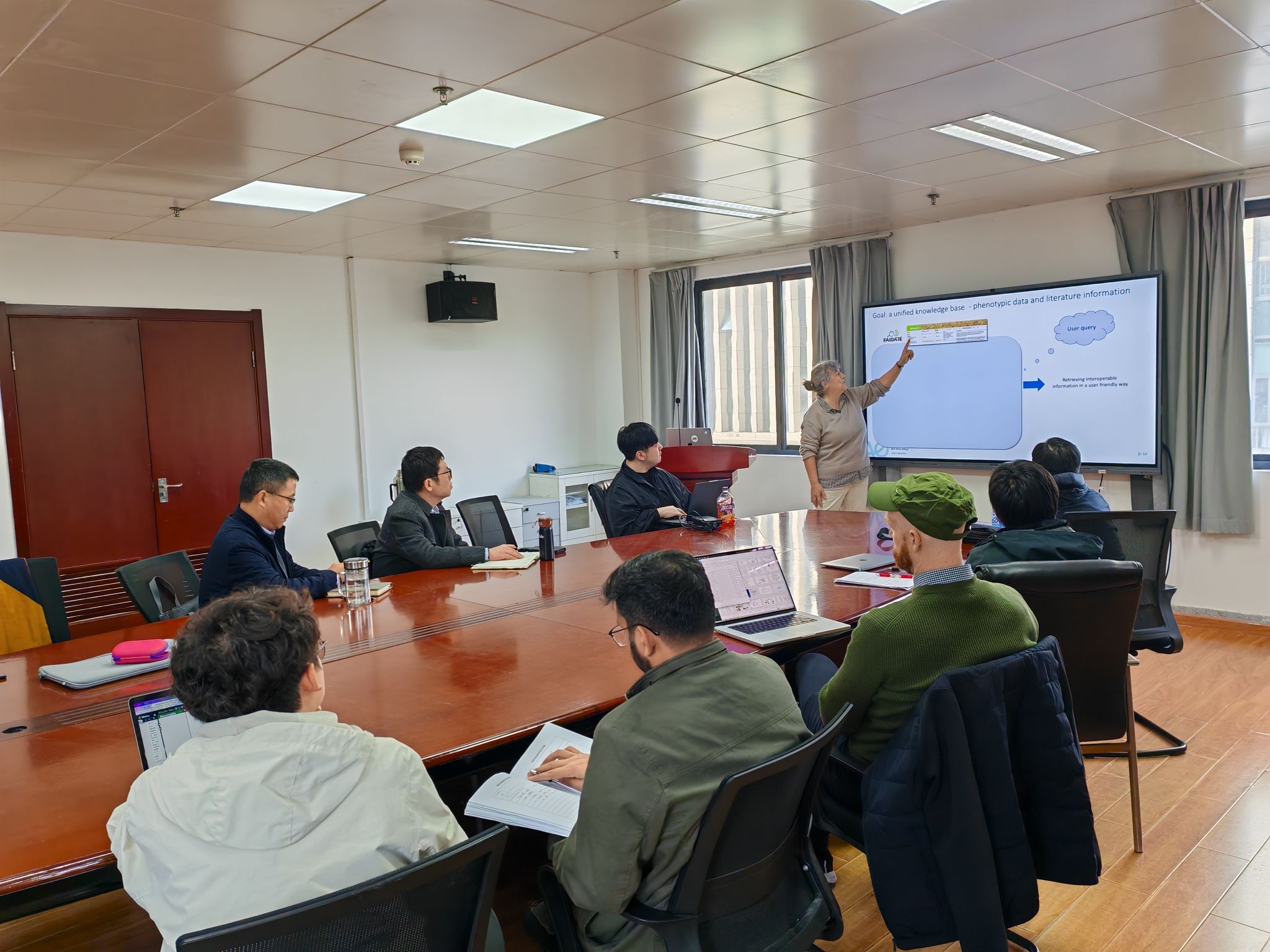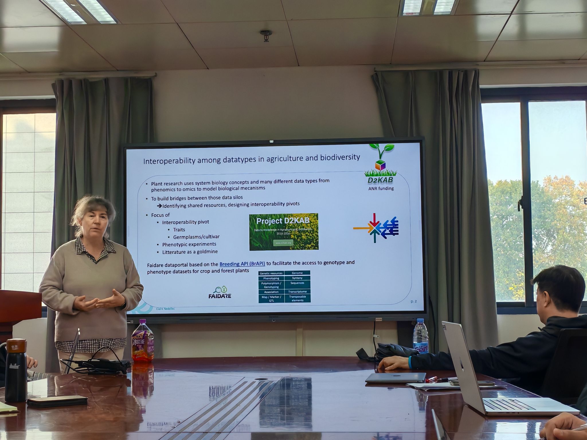 Claire博士是 MaIAGE 实验室(“从基因组到环境的应用数学与计算机科学”)的 Bibliome 研究组负责人,专注于研究机器学习和自然语言处理技术、结合本体论,从生命科学与农业领域的文本中提取知识。Claire博士的报告首先介绍了在农业与生物多样性研究中,不同数据类型之间的互操作性(interoperability)是当前系统生物学研究的重要挑战。植物研究常常需要整合从表型组学(phenomics)到多组学(omics)等多层次数据,用以建立和解析生物学机制模型。为打通这些相互孤立的数据孤岛,研究者正致力于识别共享资源并设计“互操作枢纽”(interoperability pivots)。这些枢纽主要聚焦于4类核心对象:性状(traits)、种质/品种(germplasms or cultivars)、表型实验(phenotypic experiments)以及文献(literature)——其中,文献被视为知识挖掘的“金矿”。在此基础上,INRAE 等机构开发了 FAIDARE 数据门户,该门户基于 Breeding API(BrAPI) 标准构建,旨在为农作物和森林植物的基因型与表型数据集提供便捷统一的访问途径,从而促进不同数据类型之间的互联与共享。Claire博士展示一个新颖的自然语言处理(Natural Language Processing,NLP)框架,旨在从作物的文本描述中自动提取性状与表型信息,并以小麦作为验证案例讲解。Claire博士最后说明了该框架能将这些文本数据与结构化的实验数据整合到一个统一的知识模型中,最终构建的资源描述框架(Resource Description Framework,RDF),为跨作物育种的异构数据查询提供了一个强大且无缝衔接的解决方案。